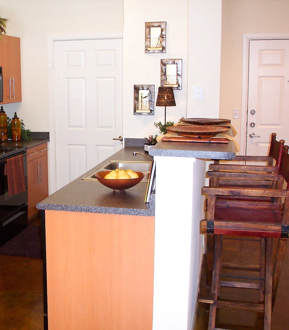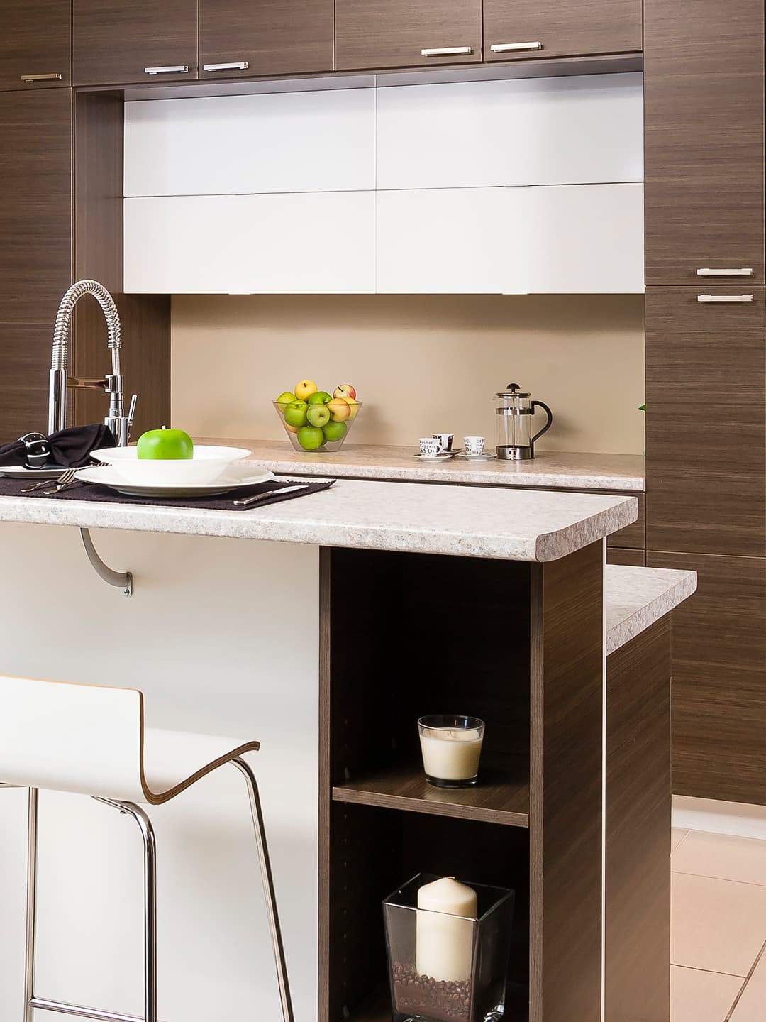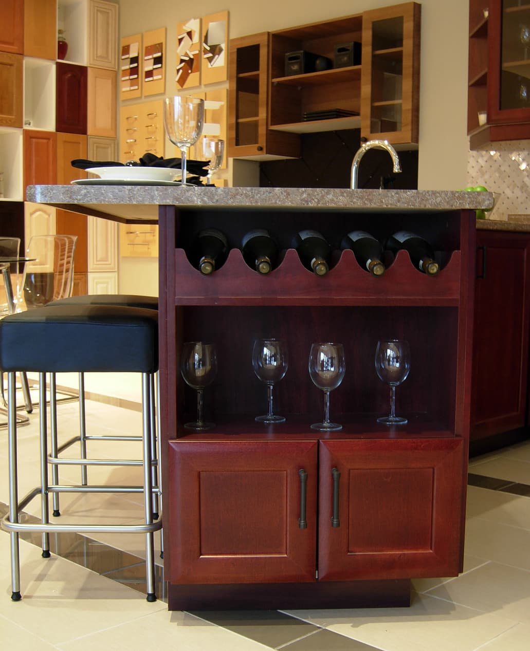 Kitchen island breakfast bar with built-in wine storage and lower cabinet space.