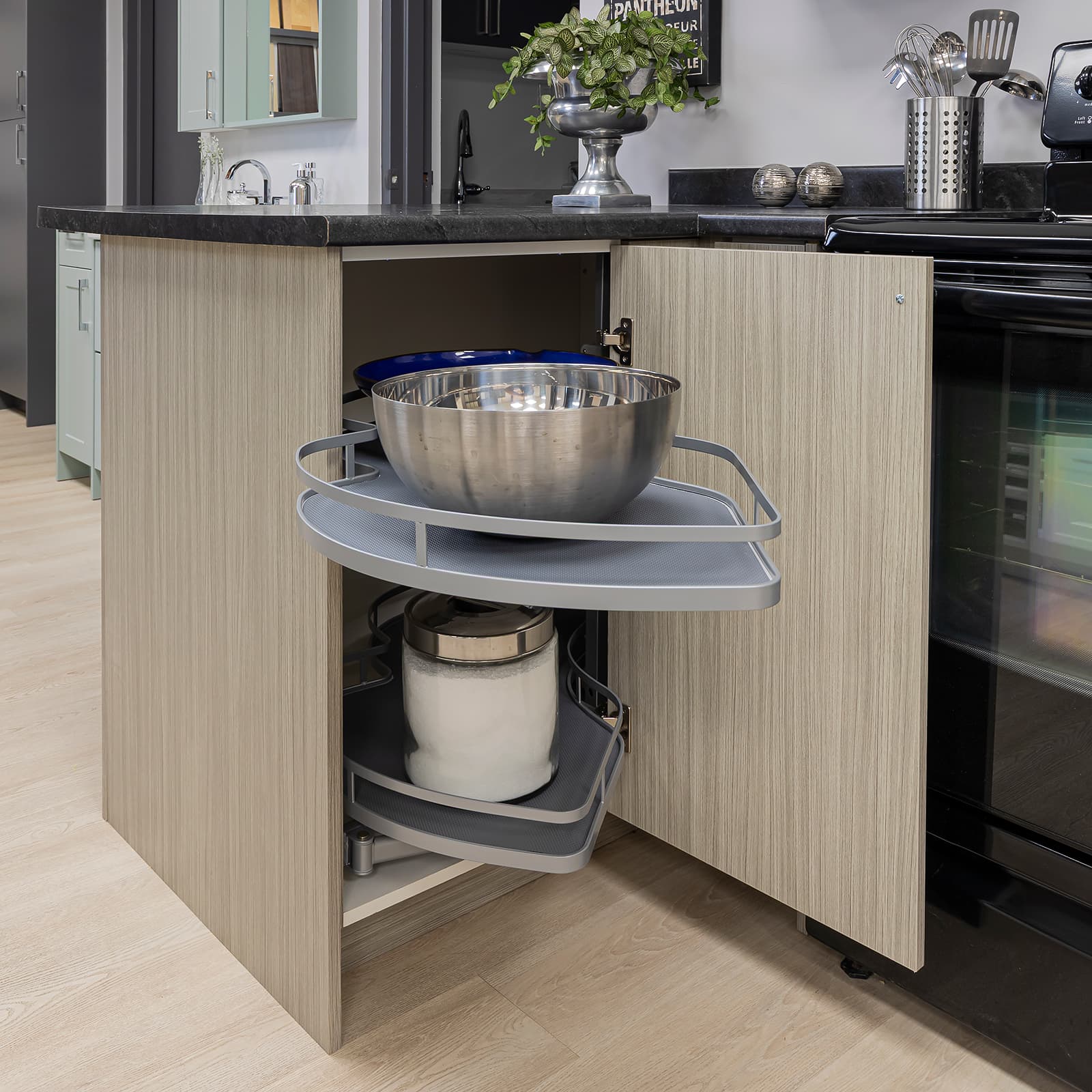 Base corner cabinet designed to maximize storage in tight kitchen spaces.