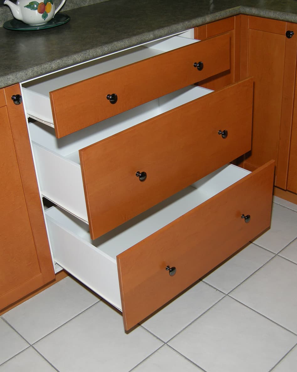 Base cabinet with top drawers and full-height doors for accessible kitchen storage.