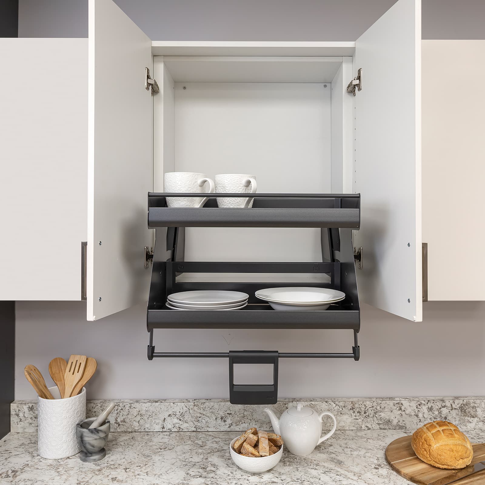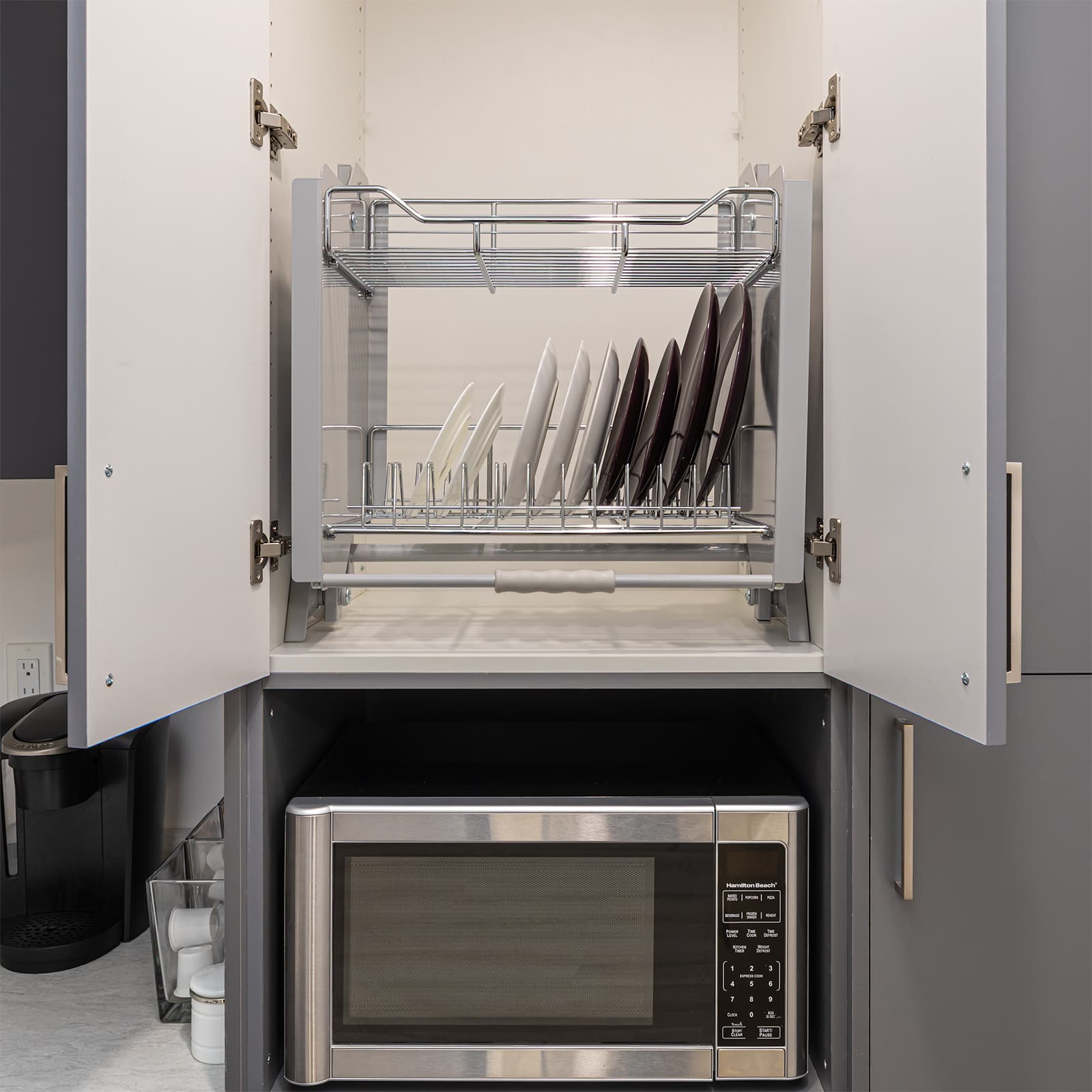 Pull-down upper cabinet shelving for easy, accessible reach from a seated position.