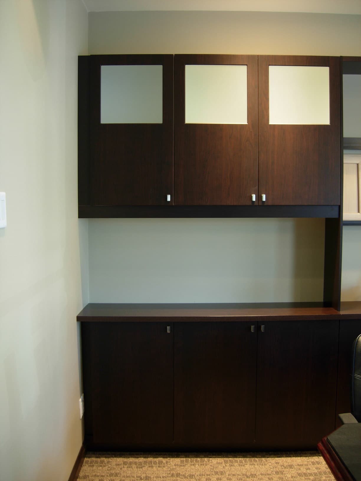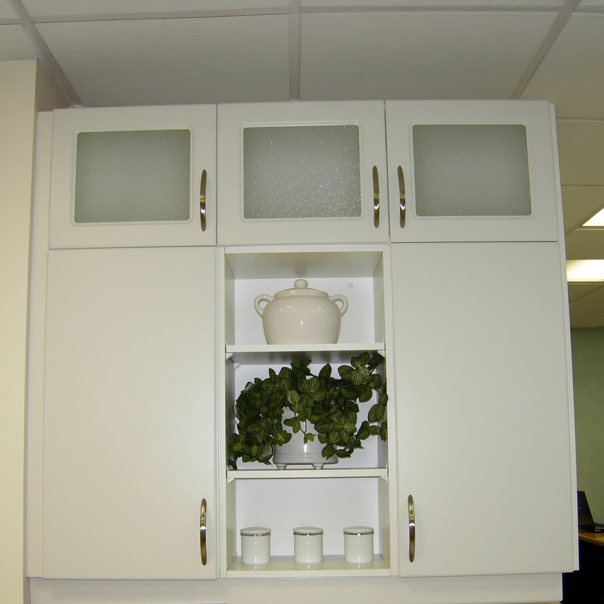Stacked upper cabinets with frosted glass doors and an open center display shelf.