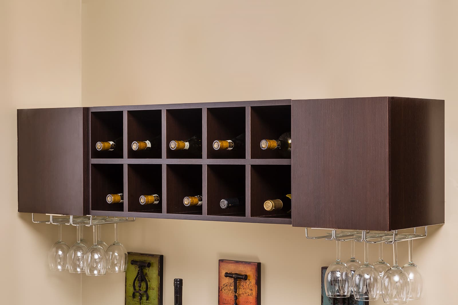 Wall-mounted wine rack with pigeonhole storage and hanging glass holders.
