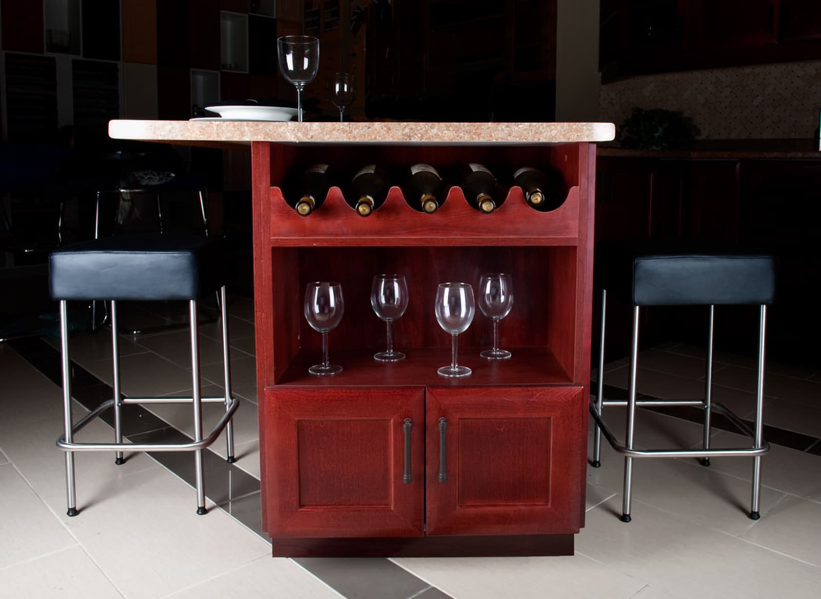 Kitchen island breakfast bar with built-in wine storage and lower cabinet space.