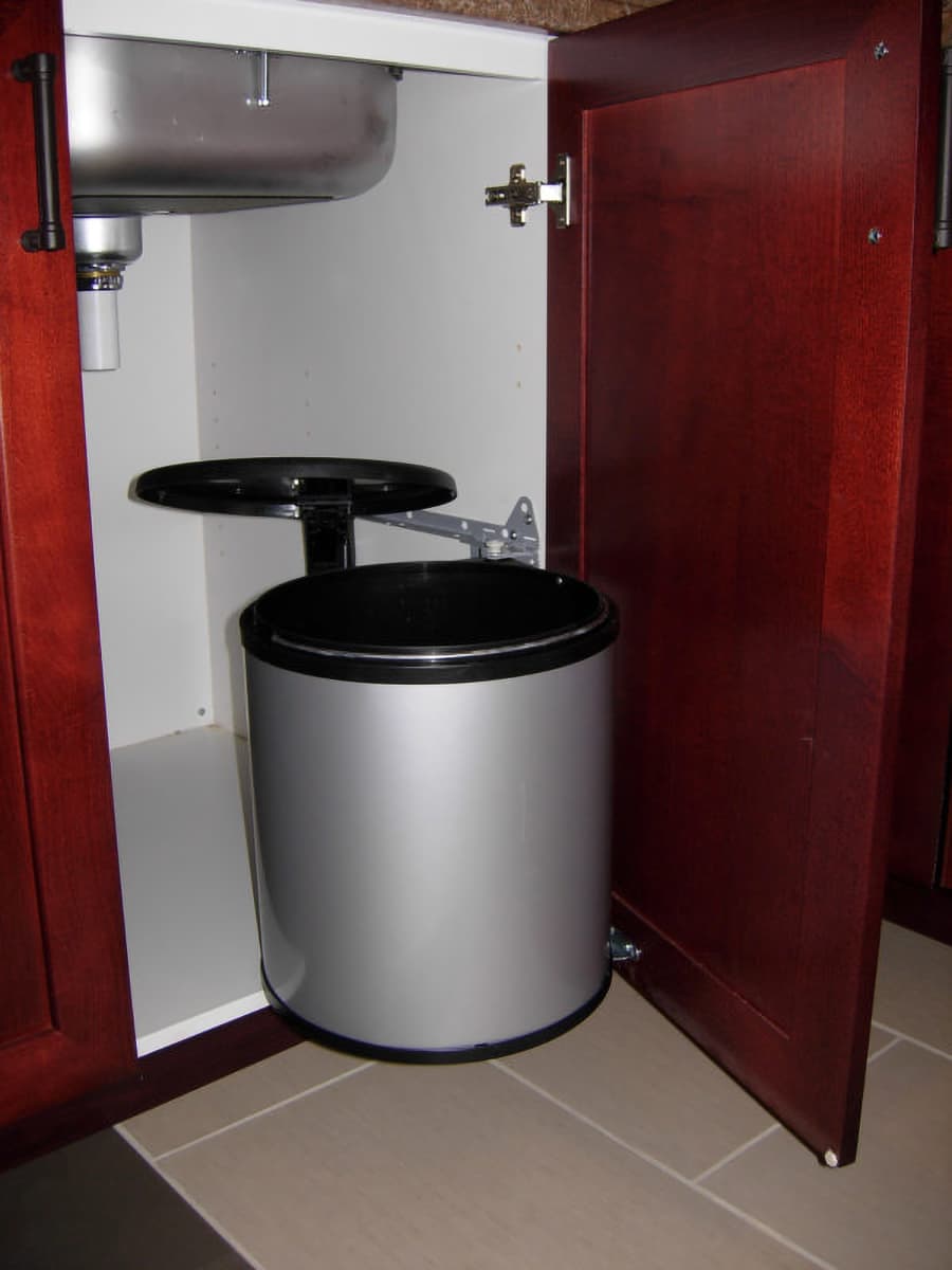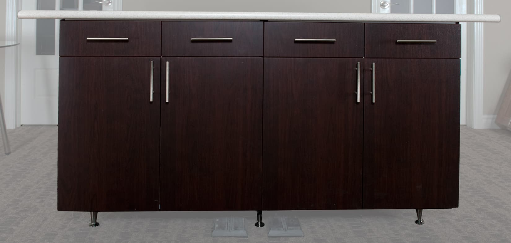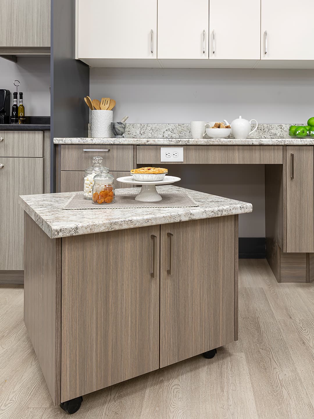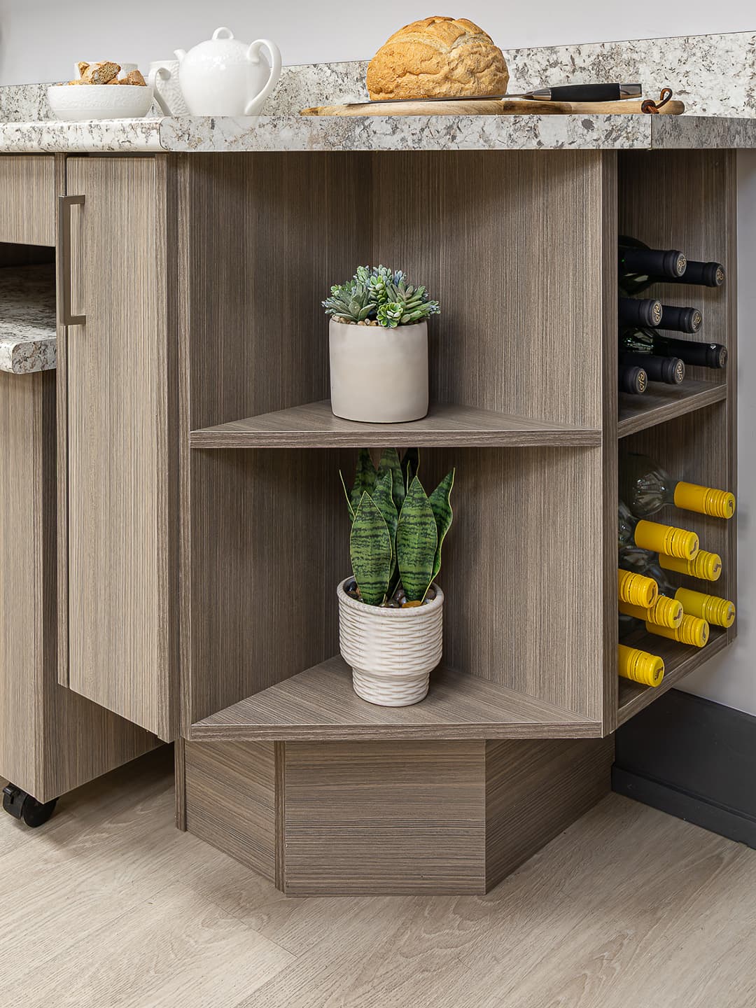 Pull-down upper cabinet shelving for easy, accessible reach from a seated position.