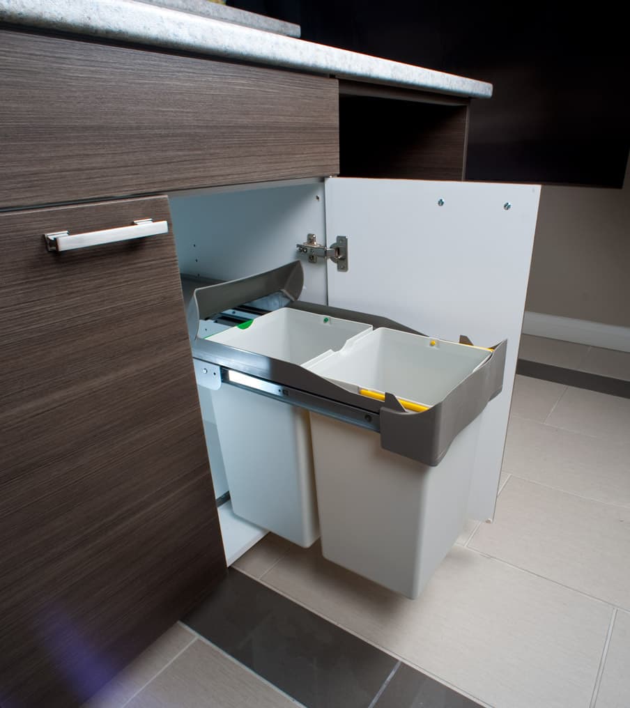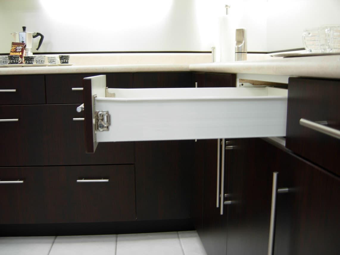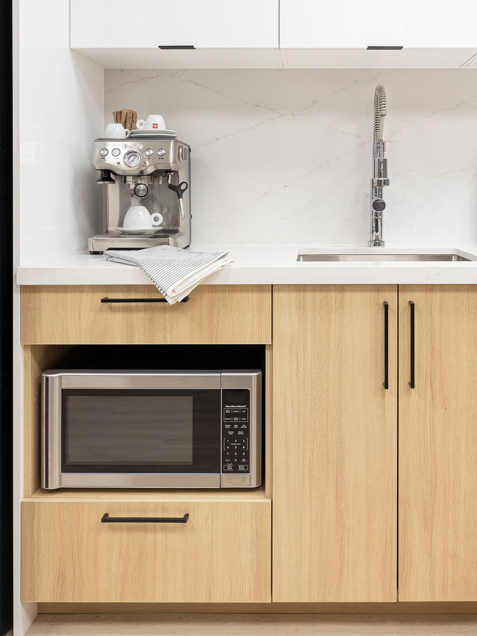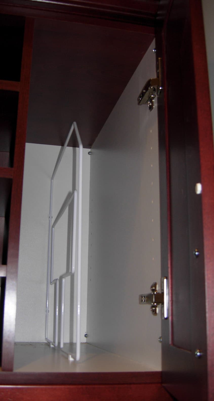 Pull-down upper cabinet shelving for easy, accessible reach from a seated position.