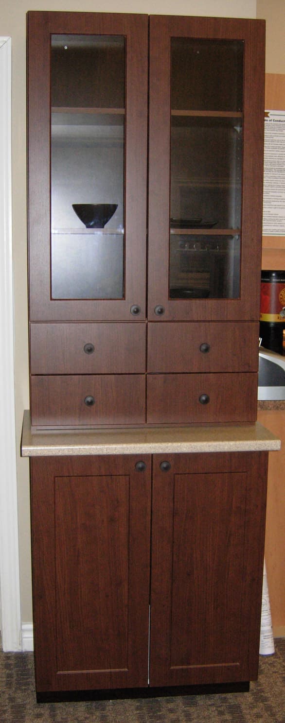 Stacked upper cabinets with frosted glass doors and an open center display shelf.